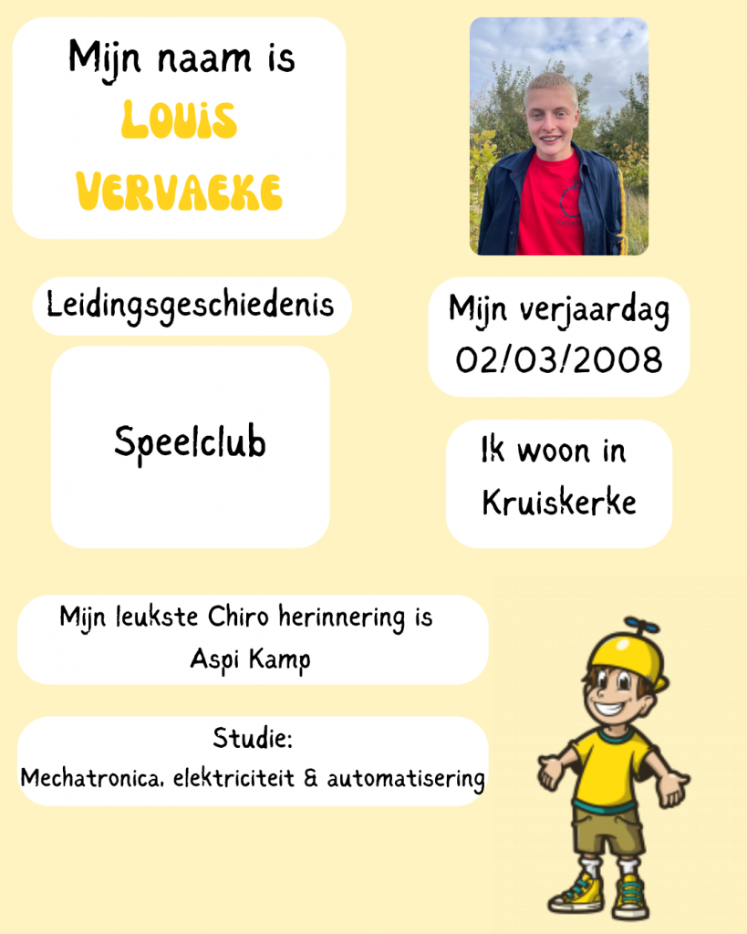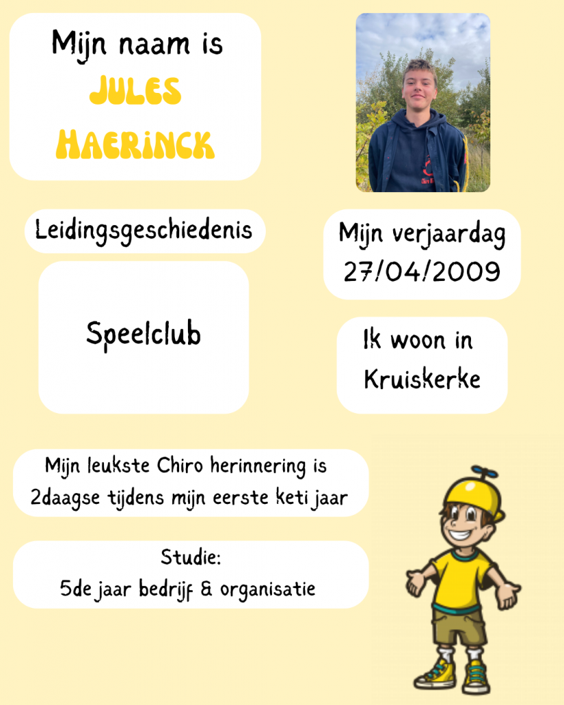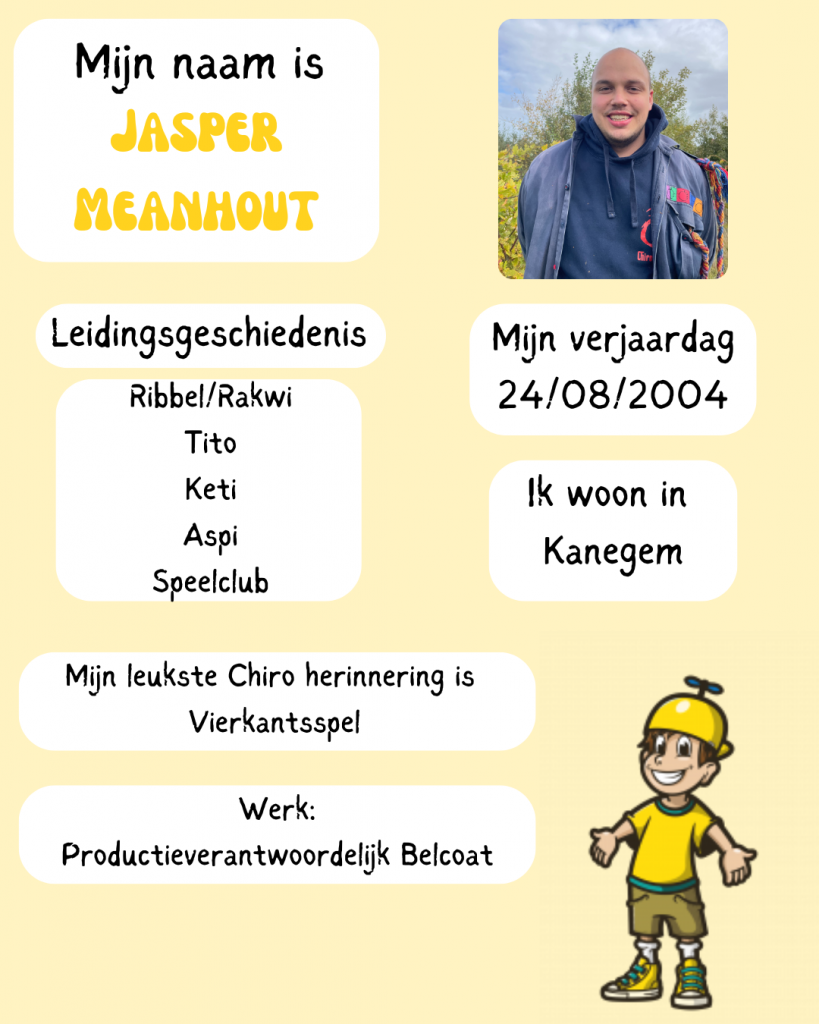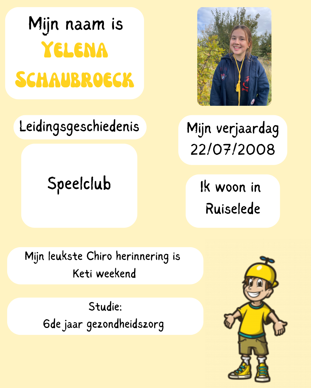 Hun afdelingskleur is geel en ze zijn elke zondagnamiddag terug te vinden bij Jasper, Yelena, Jules en Louis. Zij voorzien zotte namiddagen met veel coole spelen ! Heb je zin om hen te vergezellen, kom gerust een kijkje nemen op zondagnamiddag in de chirolokalen van 14u tot 16u30!