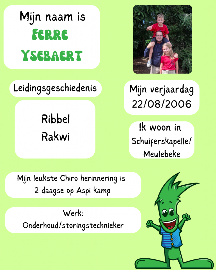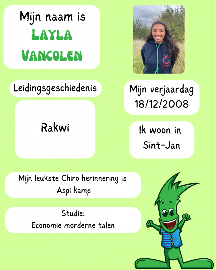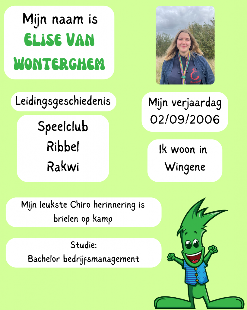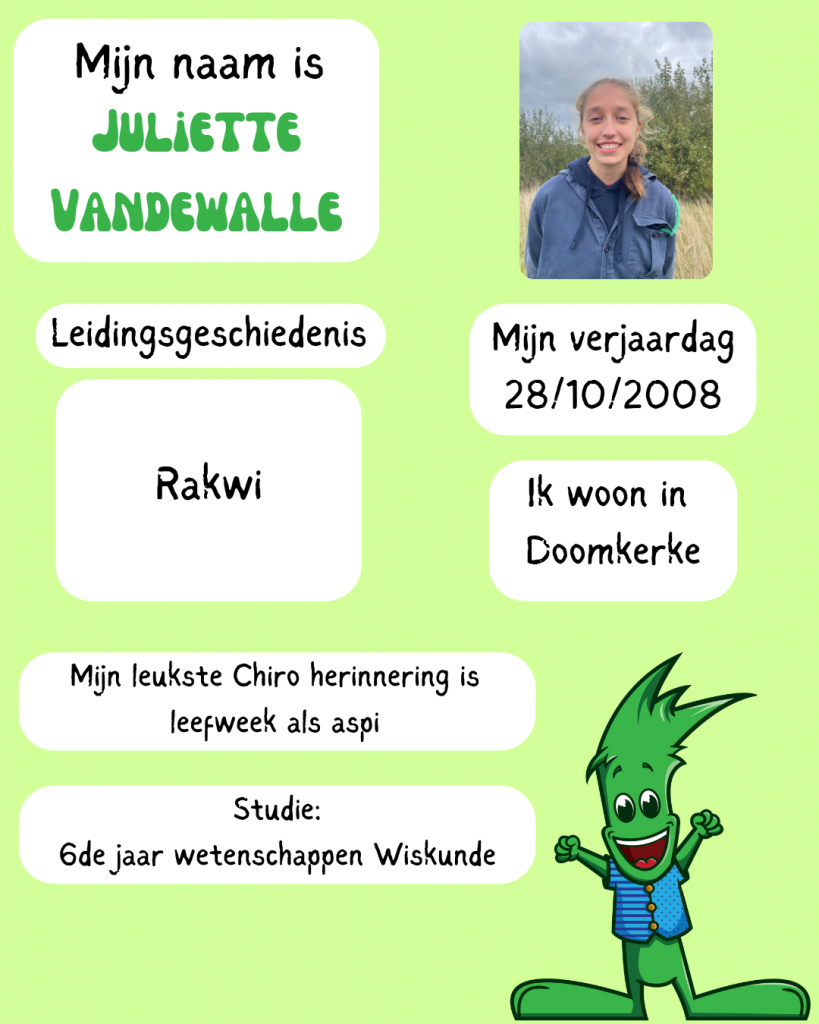Hun afdelingskleur is groen en ze zijn elke zondagnamiddag terug te vinden bij Elise, Ferre, Juliette en Layla. Zij voorzien mega coole namiddagen met veel plezier en uitdaging ! Heb je zin om hen te vergezellen, kom gerust een kijkje nemen op zondagnamiddag in de chirolokalen van 14u tot 16u30!